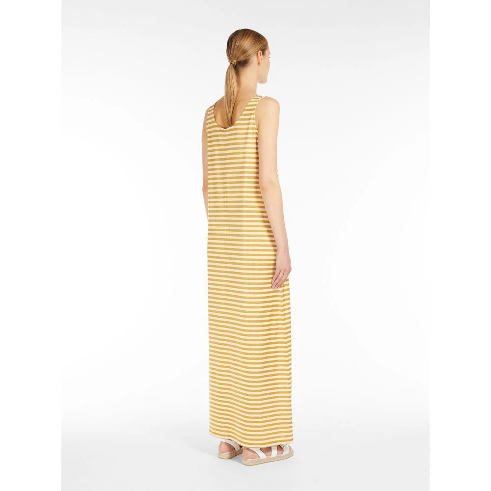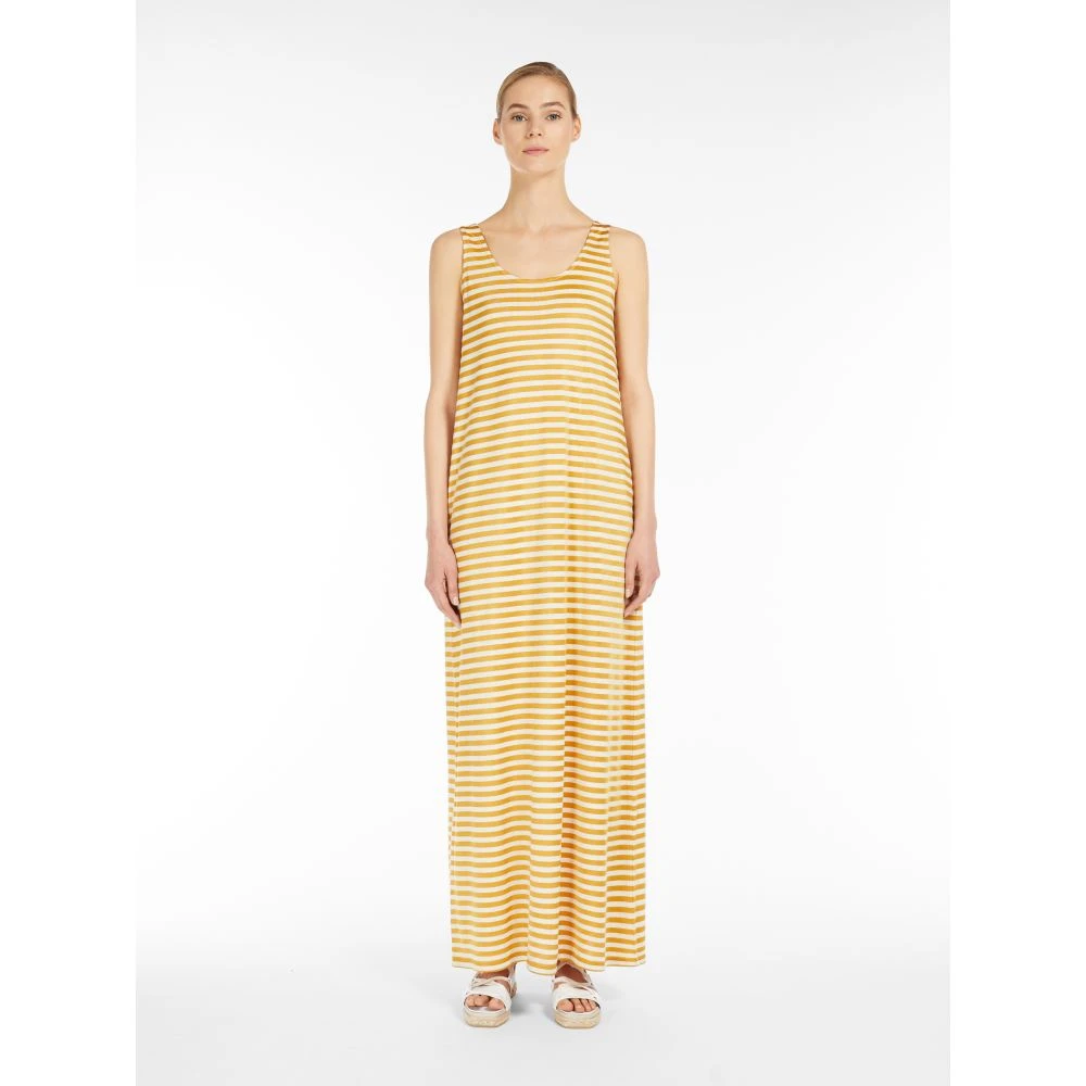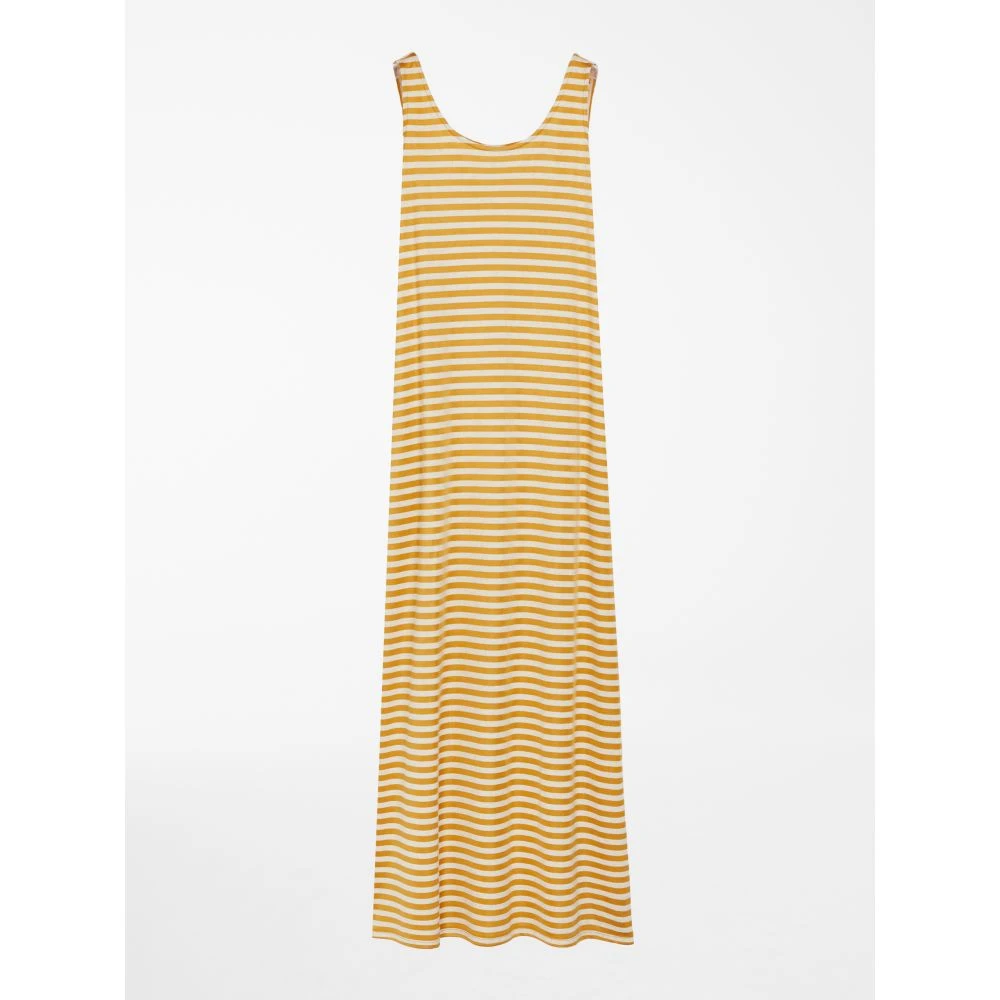 Robe longue sans manches en jersey de lin et viscose à rayures et à la coupe fluide. Le modèle présente un décolleté rond sur le devant et au dos. Poches insérées sur les côtés.