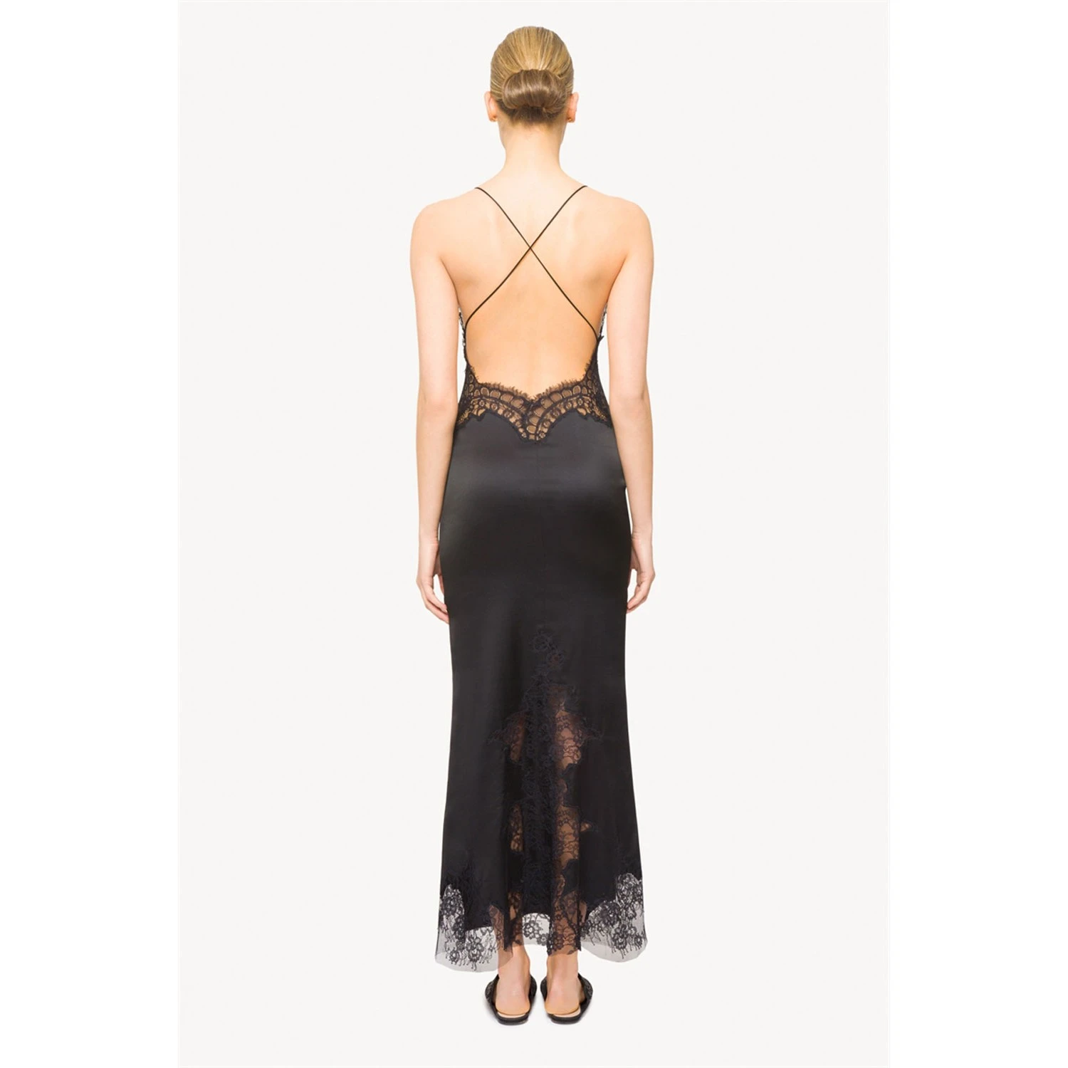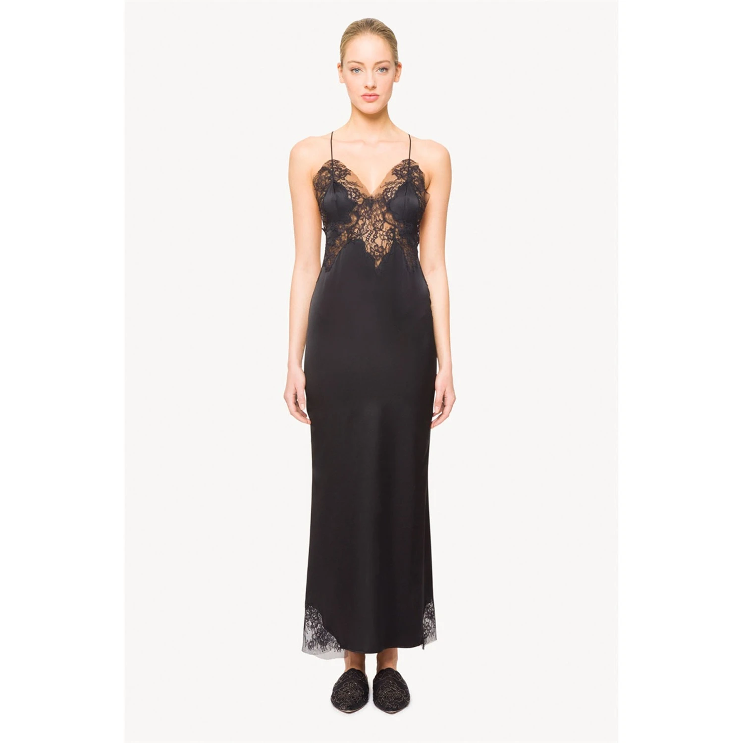 Robe en satin de soie est enrichie par des touches de dentelle sur l’encolure et le bas, pour crĂ©er un jeu sensuel de transparences. Deux fines bretelles se croisent dans le dos rehaussant avec maestria le profond dĂ©colletĂ© dans le dos.