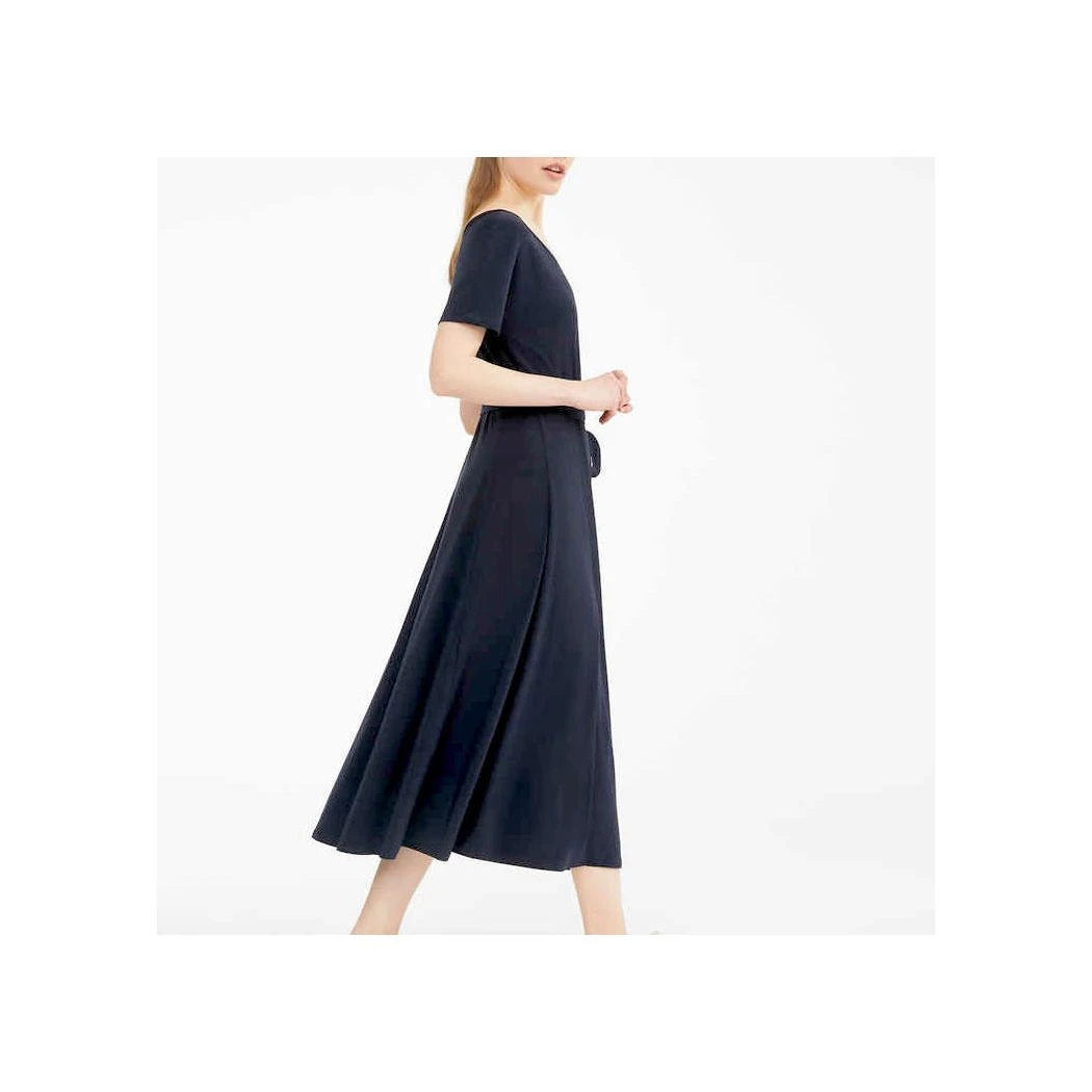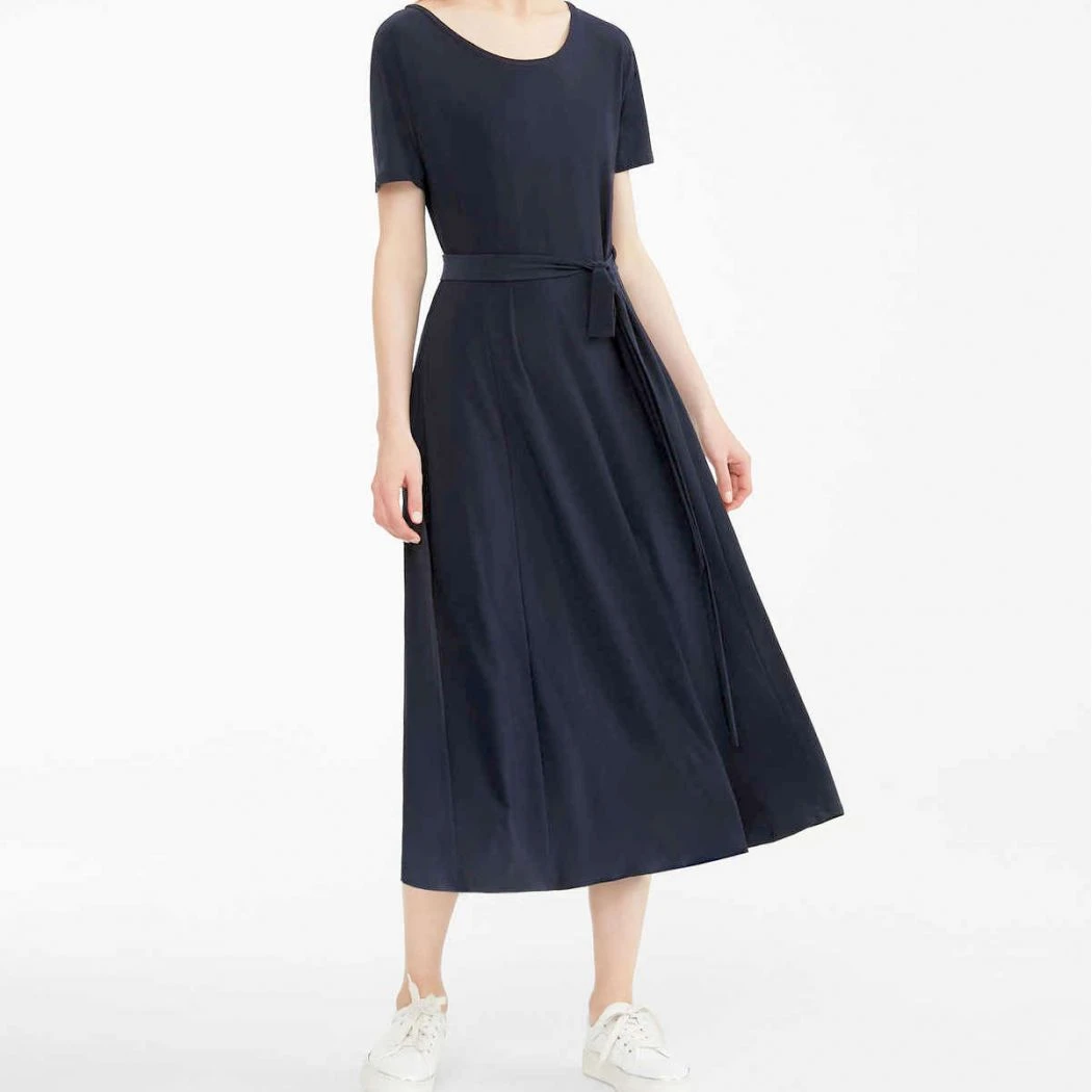Robe redingote mi-longue en jersey stretch, avec large décolleté rond et manches courtes. Vêtement non doublé et coupe évasée au bas. Coupe confortable. Fermeture avec ceinture assortie.