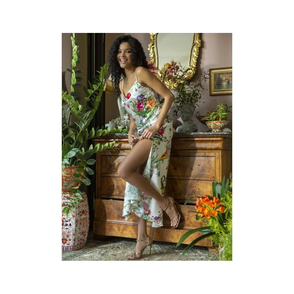 Un peu d’évasion et de fraîcheur avec cette robe longue en satin de soie imprimé de bouquets de fleurs inspiré d’un foulard de famille. Des tons pétillants et une fente saisissante pour égayer votre quotidien.