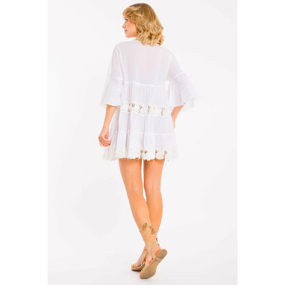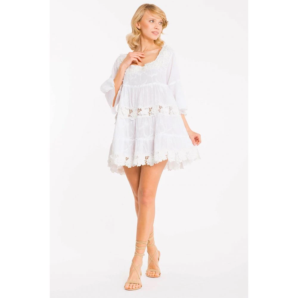 Robe ample en coton brodé avec manches ¾ et empiècements en dentelle.