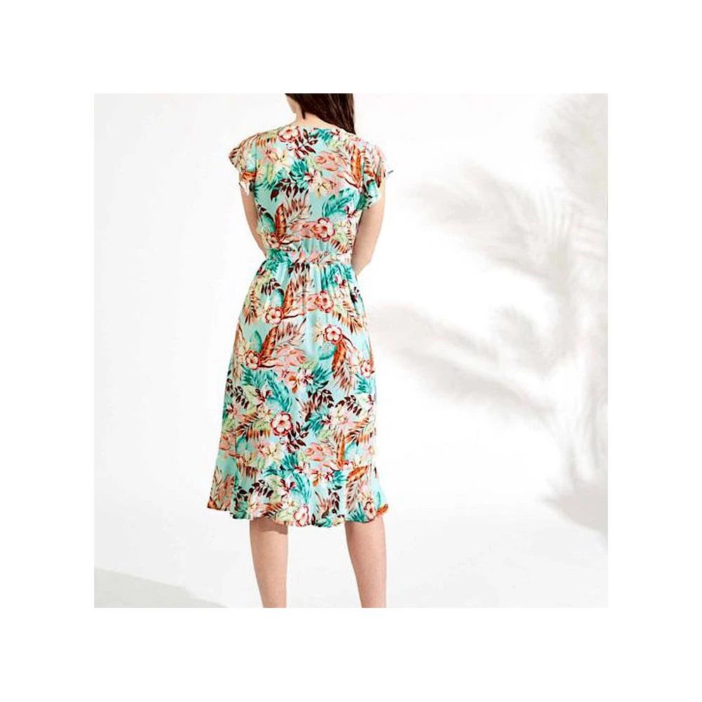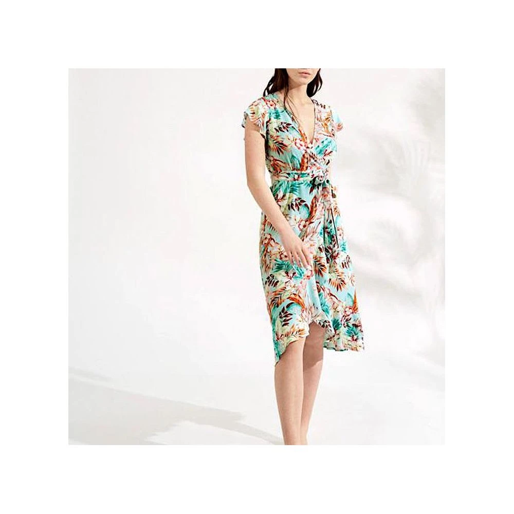Robe de style enveloppant. Des feuilles et des fleurs dĂ©tendues sur un fond turquoise dans ce tissu lĂ©ger et fluide. NouĂ© Ă la taille, elle dĂ©finit la silhouette. IdĂ©al pour les jours et les nuits d’Ă©tĂ©.