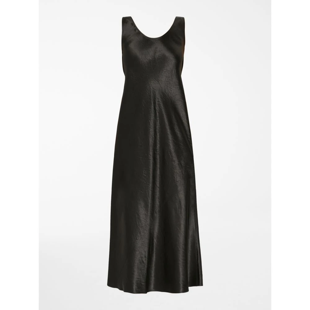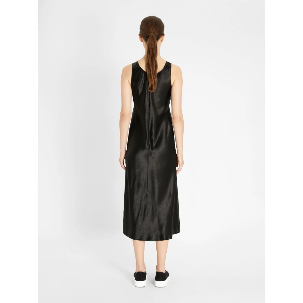 Robe longue sans manches en satin d’acétate, décolleté rond et découpe diagonale sur le devant.