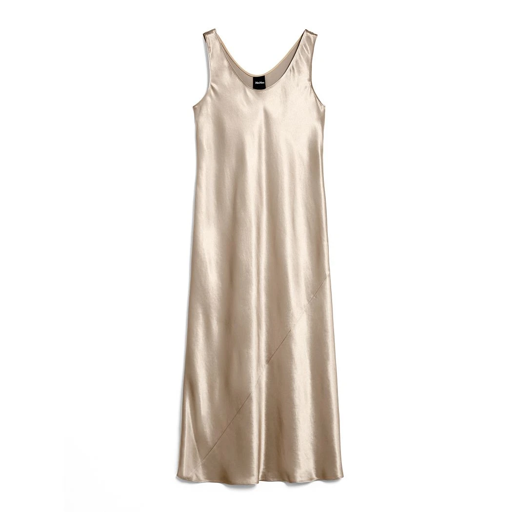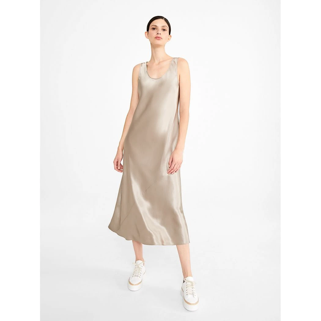 Robe midi coupe trapèze sans manches en satin lavé, avec encolure ronde sur le devant et dans le dos et épaules larges. Vêtement non doublé à la coupe souple et fluide.